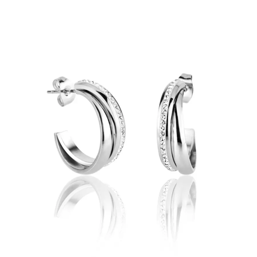 Este brinco de aço inox meia argola com 2 fios, um adornado com micro zircônias cristal, une sofisticação e brilho discreto. Perfeito para ocasiões especiais ou uso diário, ele oferece durabilidade e um toque de glamour. Garanta o seu agora!